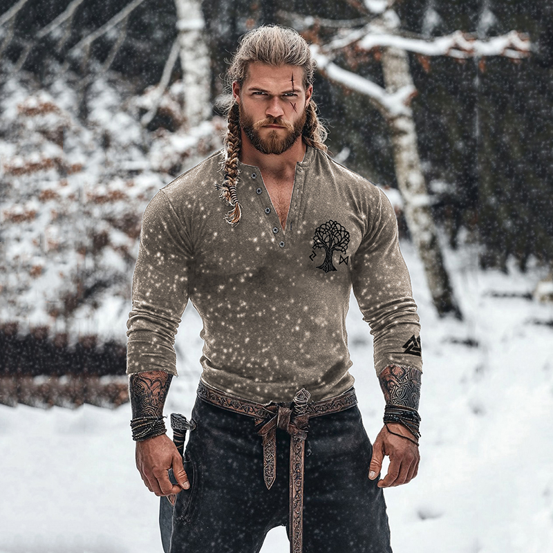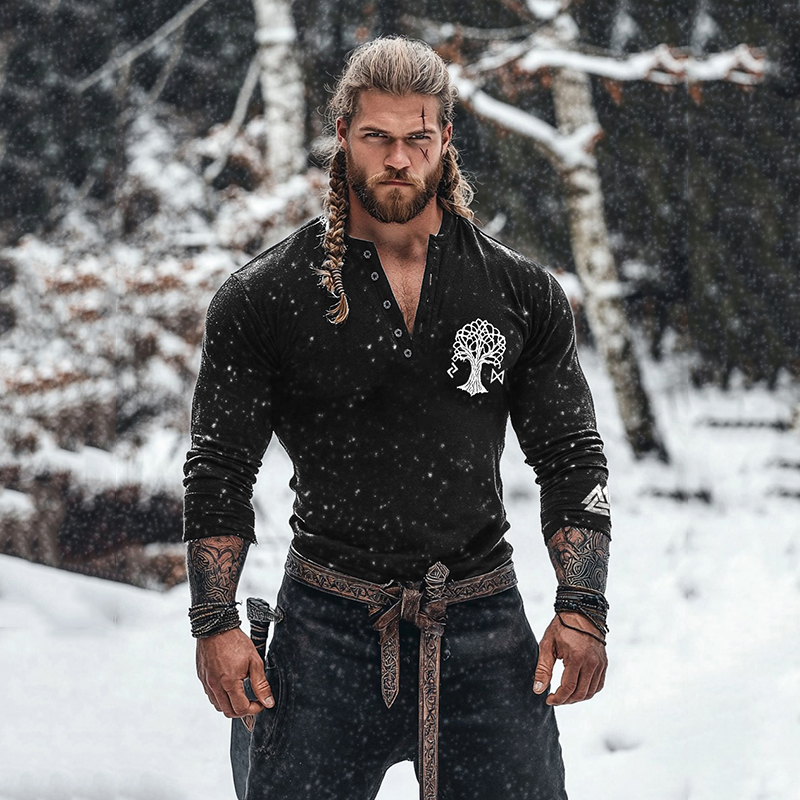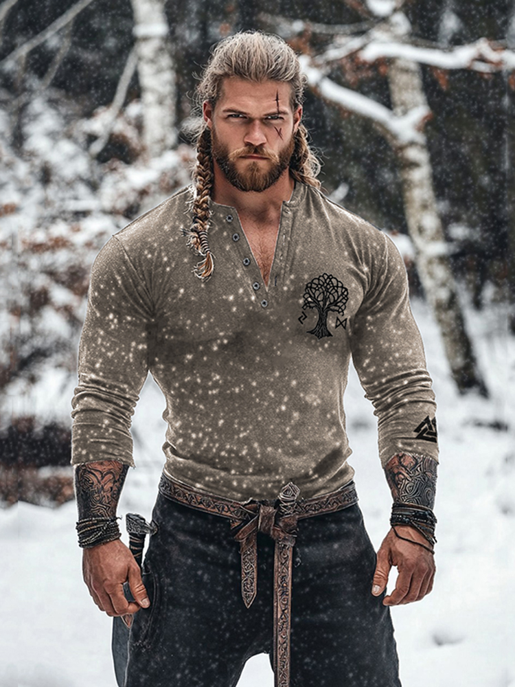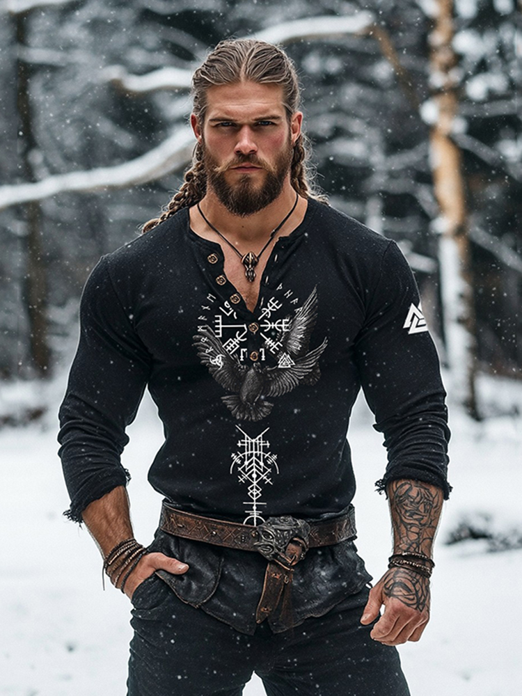 Men's Tribal Viking Runes Graphics Henley Collar Long Sleeves Basic T-shirt